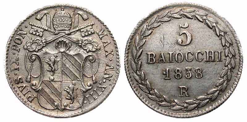 Italy, Papal States. Pius IX. 1846-1878. AR 5 baicchi (16.7 mm, 1.43 g, 12 h). Rare. ·PIVS· IX· PON· MAX· AN·XIII·, Papal coat of arms / 5 BAIOCCHI, 1858, R, within wreath. KM 1341a; Berman 3319; CNI 144. choice AU, scratch on reverse.