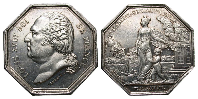 France. Louis XVIII. Silver Jeton (30.9 mm, 13.47 g, 12 h). 1818. LOUIS XVIII ROI DE FRANCE, BARRET, bust left / CIE D'ASSURANCES G LES A PARIS, MDCCCX, BARRET, Woman standing, embraced by small child, she holds a shield. Sailing ship and anchor to left, building to right. VF, octagonal flan.