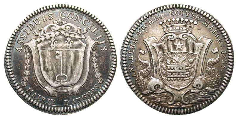 France. Silver Jeton (30.9 mm, 9.42 g, 6 h). 1785. ANS. RENÉ BUCHER ÉCUYER MAIRE, 1785, crowned shield, supported by two fish / ASSIDUIS CONCILIIS, MARIE D'ANGERS, shield with key, draped with garland. Feuardent 8517. VF.