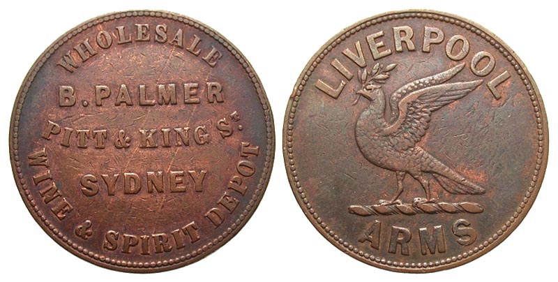 Australia, Trade Token. CU Penny (34.1 mm, 14.46 g, 12 h). Benjamin Palmer - Liverpool Arms, Sydney, New South Wales, Australia, ca. 1857. Scarce. B.PALMER PITT & KING ST. SYDNEY WHOLESALE WINE & SPIRIT DEPOT, legend in five lines / LIVERPOOL ARMS, liver bird standing on rope facing left with wings spread and holding an olive branch in beak. aVF, bag marks.