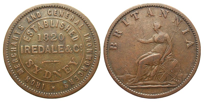 Australia, Trade Token. CU Penny (34.0 mm, 16.19 g, 1 h). Heaton & Sons, Birmingham, England, ca. 1851. Very Rare. ESTABLISHED 1820 IREDALE & CO. SYDNEY IRON MERCHANTS AND GENERAL IRONMONGERS, legend around and within circle / BRITANNIA, Britannia seated left on shield, holding trident and olive branch; a sailing ship on the horizon left. VF, bag marks.