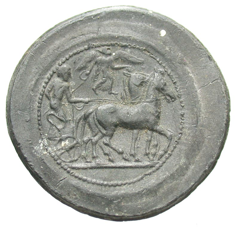 Sicily, Syracuse. Hieron I. 478-466 B.C. PB tetradrachm (32.3 mm, 12.62 g). UNIFACE LEAD / ROSA OFF-METAL TRIAL STRIKE. Charioteer driving biga right, Nike flying left above / Uniface, cf. BMC 4; CD -. VF.