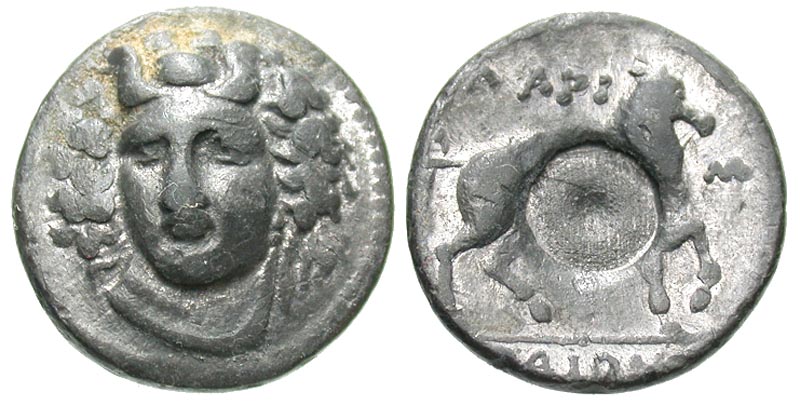 Thessaly, Larissa. Ca. 356-342 B.C. PB stater (24.1 mm, 8.24 g). BIFACE LEAD / ROSA OFF-METAL TRIAL STRIKE. Head of nymph Larissa facing 3/4 left / ΛAPI Σ AIΩN, bridled horse prancing right, mount for cufflink. cf. BMC -; CD-075v; BCD 311. EF, ex cufflink.
