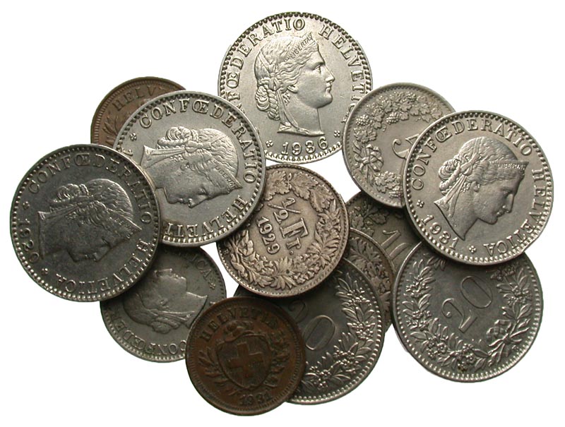 Lot of 13 Coins fron Switzerland. Assorted types and denominations, date range 1904 - 1981. Fine to EF condition.