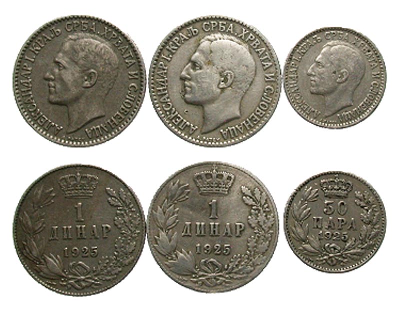 Lot of 3 Yugoslavian Coins. Alexander, 2 1 dinar, 1 50 para, dated 1925. VF condition.