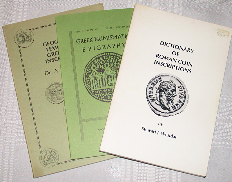 Lot of 3 Books; Ancient Coin Legends. Dictionary of Roman Coin Inscriptions; S. Westdal. 141 p. Durst reprint, 1982.Geographic Lexicon of Greek Coin Inscriptions; A. Florence. 104 p. Ares, 1966.Greek Numismatic Epigraphy. J. Hartmann & G. MacDonald. 92 p. Argonaut, 1969.