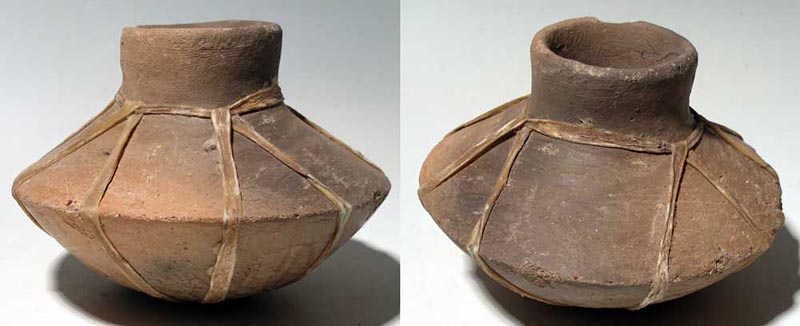 Tarahumara Jar. A rare Tarahumara jar from Mexico, ca. 1800’s. This fine lentoid form with wide spout is 5-1/4” in diameter and is decorated with a design created with rawhide. Good mineral deposits and small rim loss attest to extensive usage. Ex Quinn collection. Value range $75 - $150.