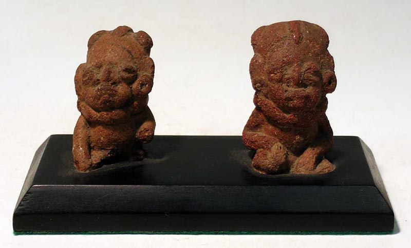 Two Maya Figures. A pair of Early Maya figures from Guatemala, ca. 100 – 400 AD. This matched duo is 2-1/4” high, posed seated and each adorned with headdress and necklace. Mounted on custom base. Ex Boston estate. Value range $150 - $300.