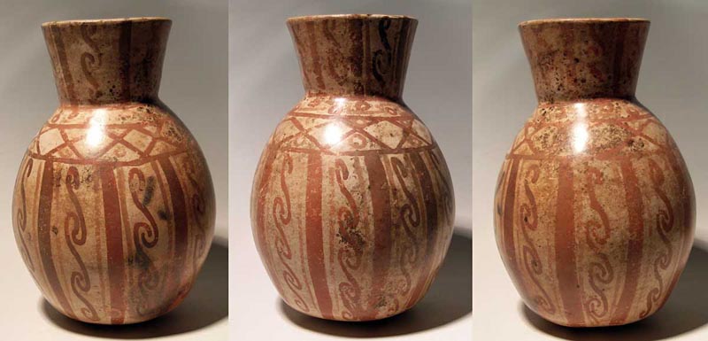 Moche Polychrome Vessel. A large Moche vessel from Peru, ca. 400 - 700 AD. This elaborately painted jar is 9-1/2" high and is decorated with a variety of boldly painted serpentine and geometric designs. Most likely a chicha container. In excellent condition, strong mineral deposits. Ex Gallatin estate. Value range $350 - $500.