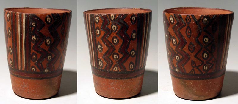 Huari Kero. A fine Huari polychrome kero from Peru, ca. 650 – 800 AD. This lovely polychrome beaker is 5-1/2” high and is decorated with a variety of linear designs setting off what appear to be disembodied eyes, perhaps a serpent design. Intact, vivid paint, good mineral deposits. Ex Caravallo collection. Value range $300 - $500.