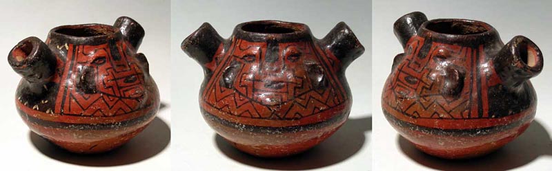 Shipibo Figural Jar. A superb Shipibo figural jar from the Upper Amazon region of Brazil or Peru, ca. 1950’s. This rare red example is 4-1/2" high, 6-1/4" wide and has a wonderful face incorporated into the side of the chamber. The influence of Andean ancestors is clearly recognizable in the facial characteristics. The traditional stylized decorative patterns are designed to imply clothing and ritual tattoos. The vessel is coated with the characteristic tree resin. Ex Boston estate. Value range $125 - $250.
