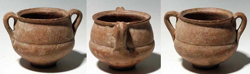 Roman Two-Handled Cup. A fine Roman two-handled cup, c. 1st - 3rd Century AD. This choice example is 5” in diameter and stands on a small ring base. The rim of this beautifully made vessel is flared and the burnished slip is covered with good mineral deposits inside and out. Ex Funiciello collection. Value range $300 - $400.