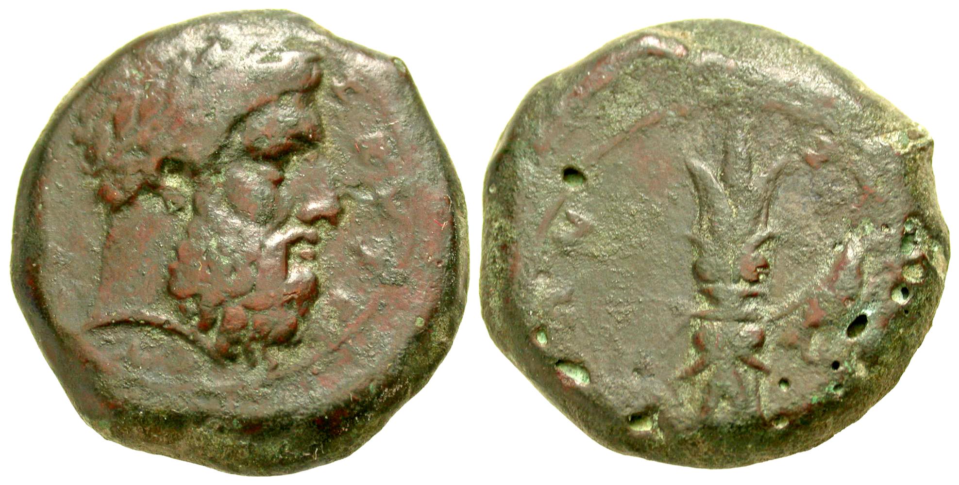 Sicily, Syracuse. 345-317 B.C. AE 24 (24 mm, 13.31 g, 2 h). ZEYΣ ΕΛ - ΕΥ-[ΘΕΡΙΟΣ], head of Zeus Eleutherios right / ΣΥ[ΡΑΚΟ-ΣΙ]ΩΝ, vertical thunderbolt; eagle to right. CNS II, p. 167, 72; SNG ANS 477; SNG Cop. 727. VF / F, somewhat off-center on smallish flan, losing much legend; multiple small casting voids on reverse; light olive/red patina.