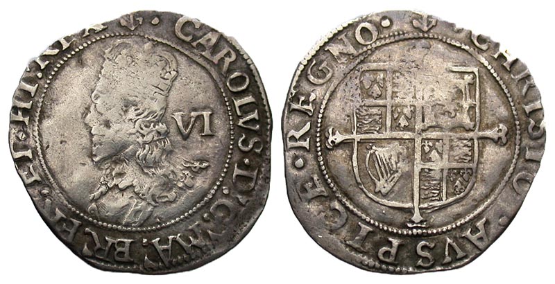 Lot 10-190. British, House of Stuart. Charles I. 1625-1649. AR sixpence. London mint. im: anchor, 1638-9.