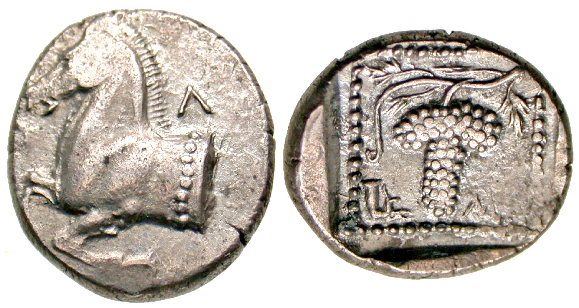 Thrace, Maroneia. 395-386/5 B.C. AR tetrobol (15.1 mm, 2.77 g, 9 h). Π-Λ, forepart of horse left / Grape bunch on vine; MA in right lower field; all within dotted linear square. Sehonert-Geiss 300.
