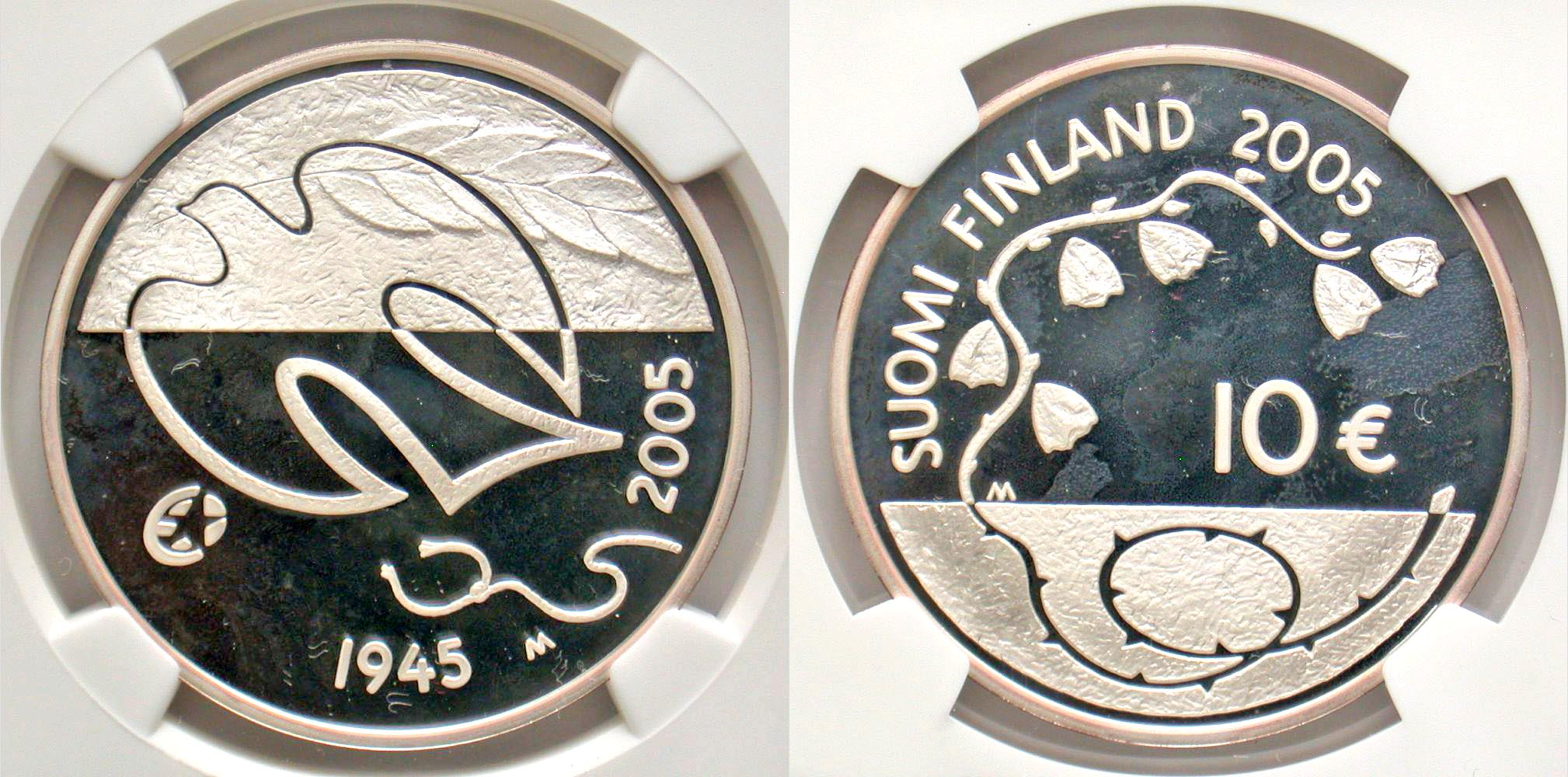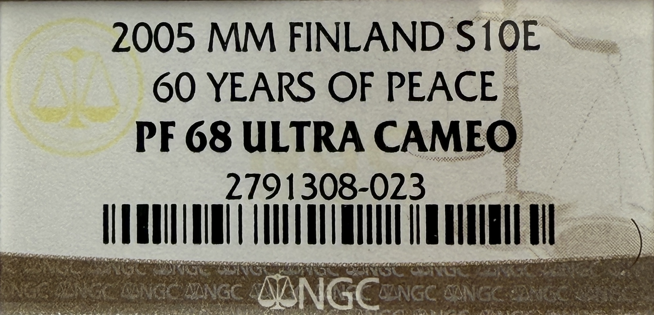 Euro, Finland. S10 Euro. 60 Years of Peace. 2005 MM. KM 120. NGC certified PF68 Ultra Cameo. NGC Certified 2791308-023
