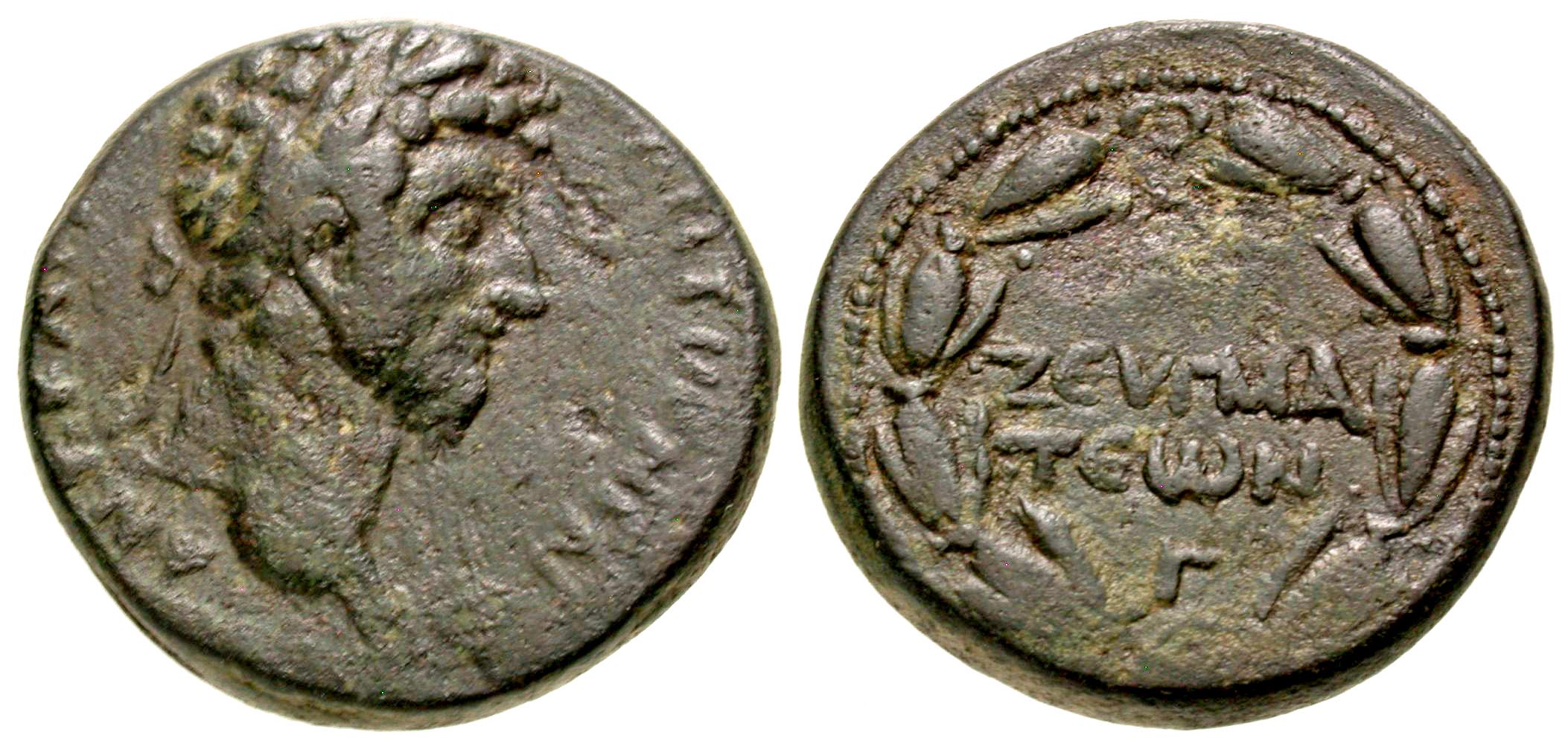 Syria, Commagene. Zeugma. Marcus Aurelius. A.D. 161-180. AE 23 (22.9 mm, 10.76 g, 1 h). ΑΥΤ ΚΑΙ Μ ΑYPH ΑΝΤ ΝΙΝΟ , laureate, draped and cuirassed bust of Marcus Aurelius right / ΖЄΥΓΜΑΤЄ Ν, legend within laurel wreath, Γ below. RPC IV.3, 8607 (temporary) ; Butcher 25; SNG Copenhagen 29 (uncertain letter below). aVF.