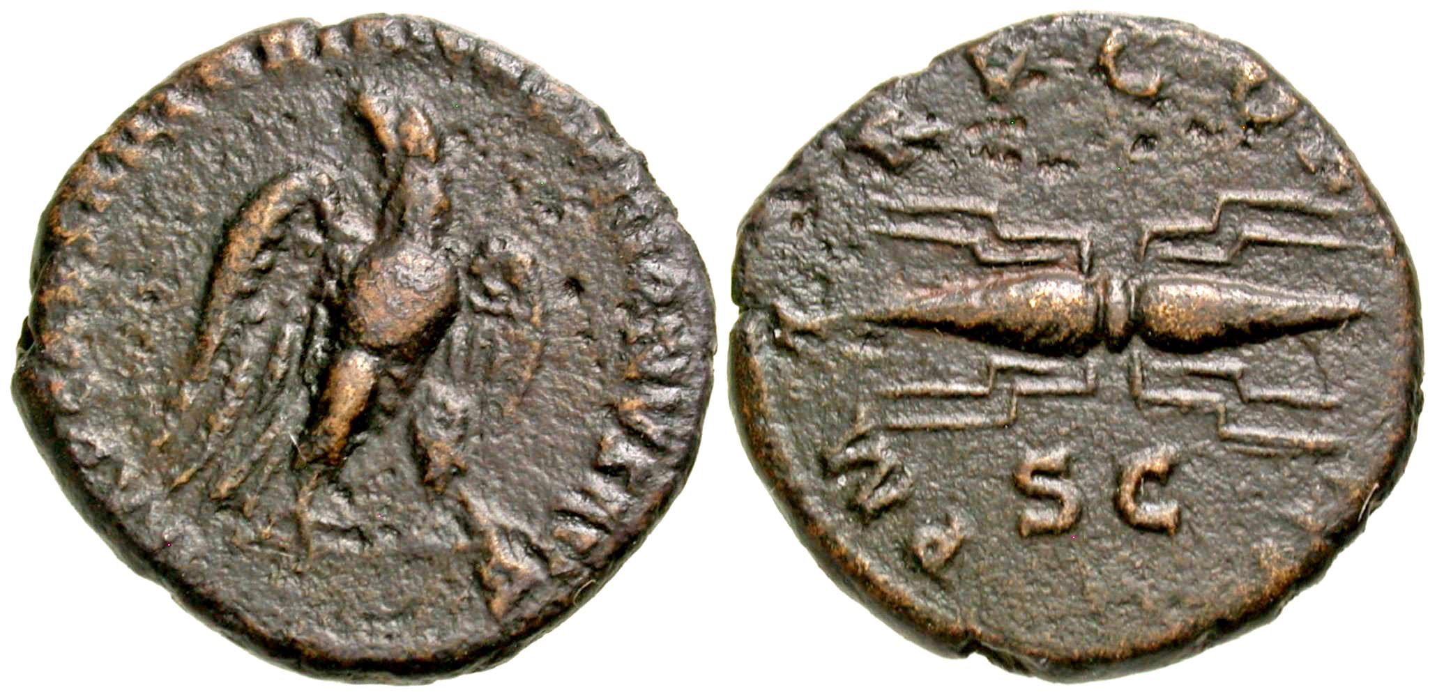Hadrian. A.D. 117-138. AE quadrans (17.5 mm, 3.00 g, 6 h). Rome mint, struck ca. A.D. 121-222. IMP CAESAR TRAIAN HADRIANVS AVG, eagle standing slightly left on thunderbolt, head right, with wings displayed / P M TR P COS III, winged thunderbolt, SC below. RIC 624; BMCRE 1278. VF.