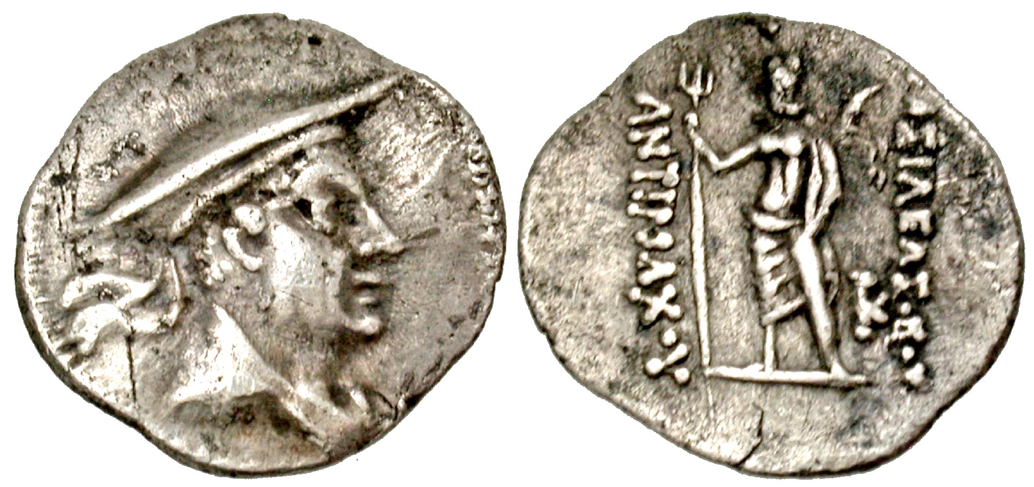 Graeco-Baktrian Kingdom. Antimachos I. Ca. 174-165 B.C. AR obol (11.9 mm, .64 g, 1 h). Ca 180-170 B.C. Diademed and draped bust of Antimachos to right, wearing flat topped kausia / ΒΑΣΙΛΕΩΣ ΘEOY ΑΝΤΙΜΑΧΟΥ, Poseidon, nude to the waist, standing facing, holding long trident in his right hand and filleted palm branch in his left; to right, monogram of KOP. Bopearachchi, Antimaque I, 4B; Bopearachchi & Rahman 185; MIG Type 127c. SNG ANS 283-288. EF. Estimated Retail Value: $250-500