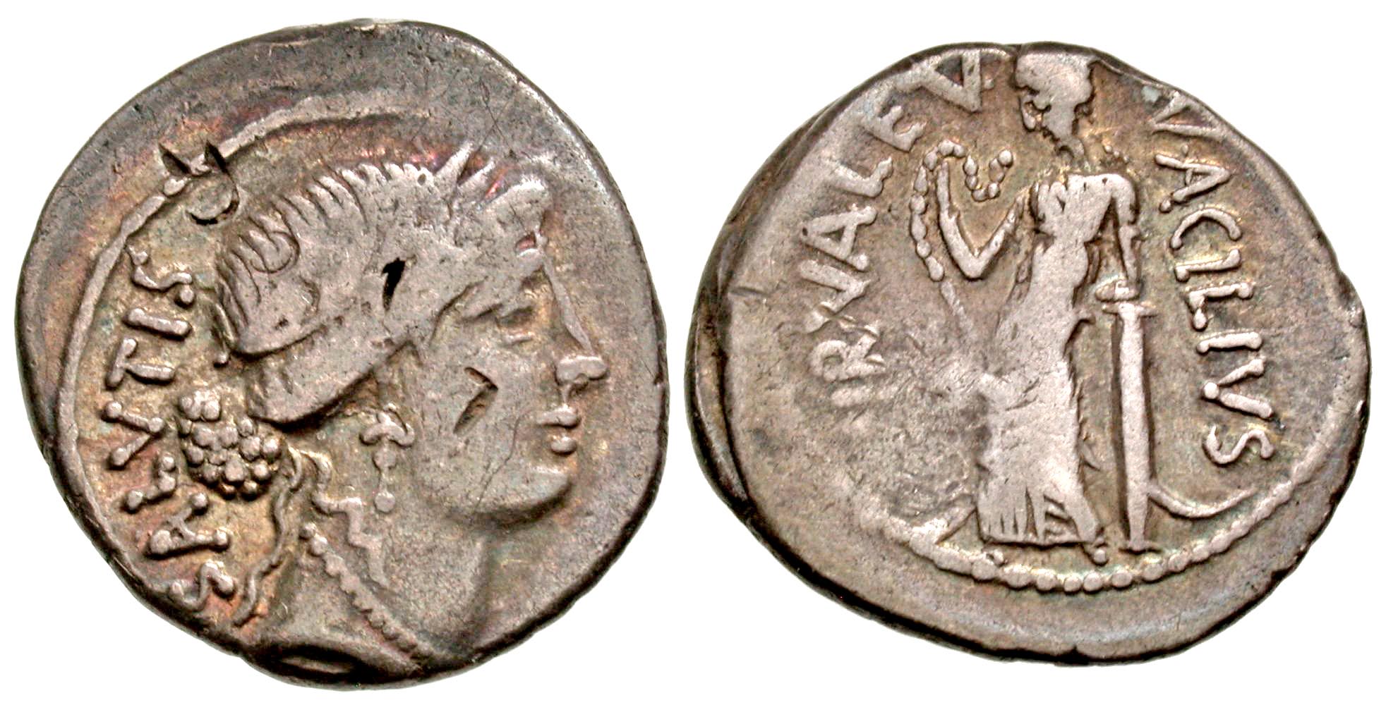 Man. Acilius Glabrio. AR denarius (19.1 mm, 3.94 g, 3 h). Rome mint , Struck c, 55 B.C.E. SALVTIS, laureate head of Salus right, SALVTIS upwards behind / MN ? ACILIVS [III] VIR ? VALETV (MN and TV in monogram), Valetudo (Salus) standing left, leaning against column and holding serpent. RRC 442/1; CRR 922; RSC/Bab Acilia 8. Near VF, somewhat off-center on irregular flan, several banker-marks on obverse. worn, but with areas of mint luster both sides; gray, old cabinet toning.