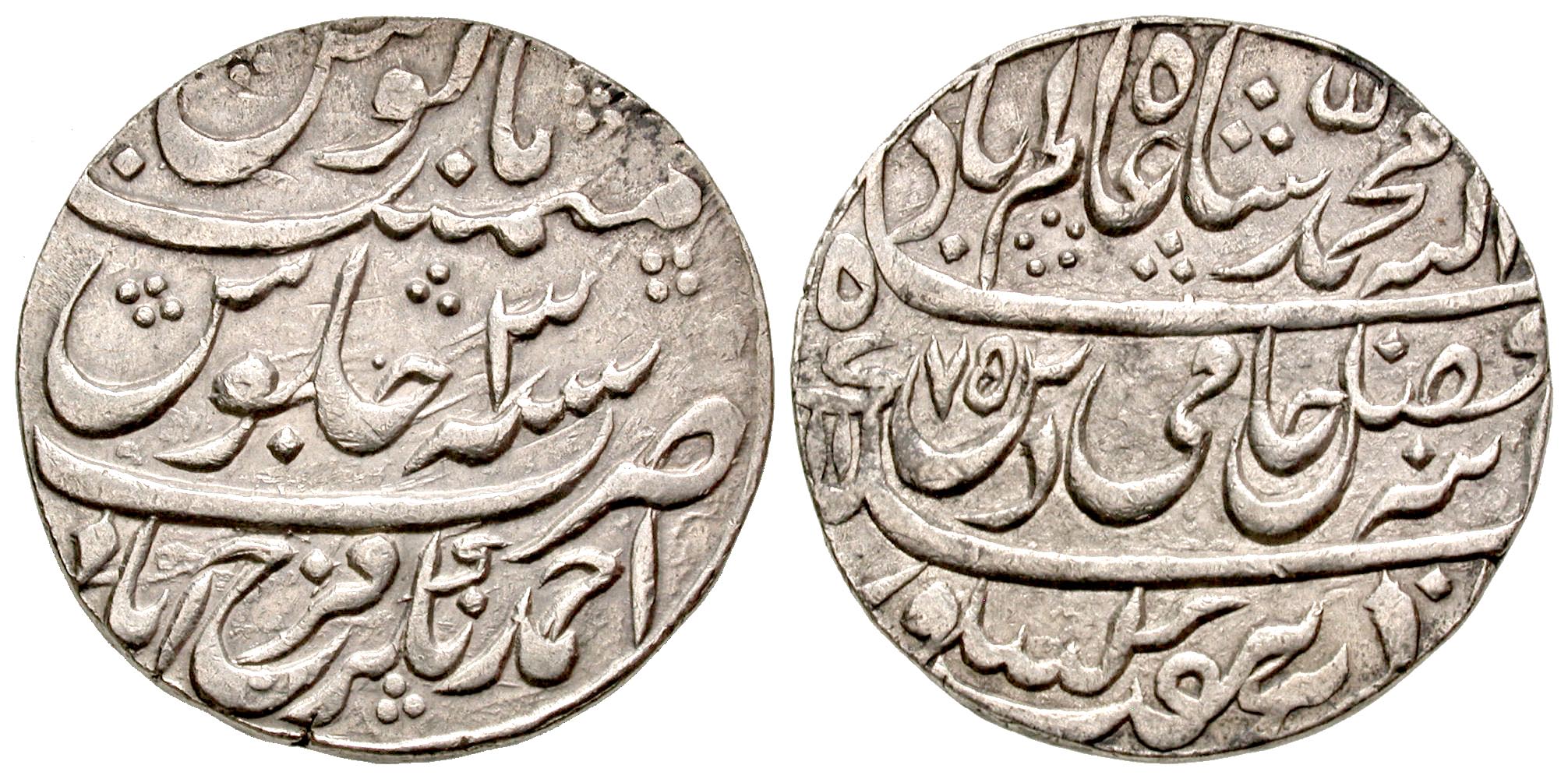 Lot 347. Bangash Nawabs. Muzaffar Jang Bangash in the name of Shah Alam II. AR rupee. Ahmadnagar Farrukhabad , AH 1175/Ry 3.