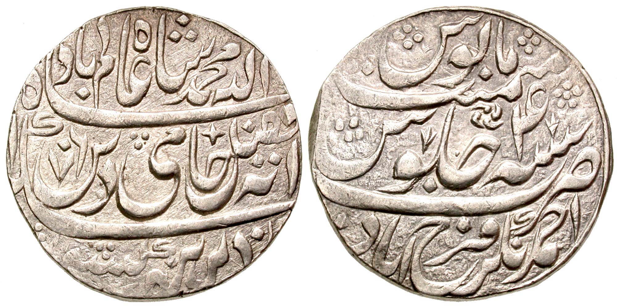 Lot 348. Bangash Nawabs. Muzaffar Jang Bangash in the name of Shah Alam II. AR rupee. Ahmadnagar Farrukhabad, AH 1176/Ry 4.
