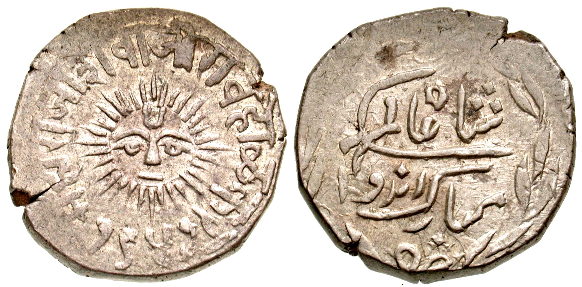 India, Princely States. Indore. Shivaji Rao. 1886-1903. AR rupee (24.2 mm, 11.19 g, 9 h). VS 1947. Sun face with legend in Devanagari script around / Legend in Persian within a wreath, naming Shah 'Alam, and mint. KM 44. aEF.