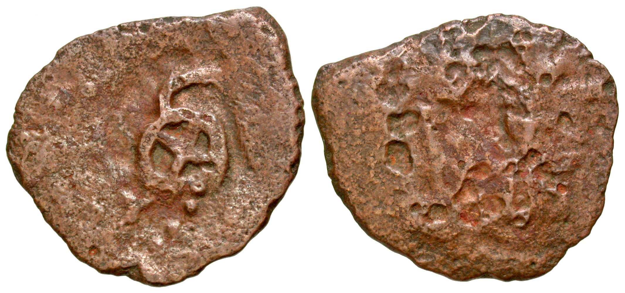 Italian States, Caffa. Genoese Colony. ca.1400-1420. AE pulo (20.2 mm, 1.62 g). Uncertain Golden Horde pulo with a "Christogram" ("Chi-rho") countermark from the Genoese Crimean colony (most probably Caffa). VG. Rare.