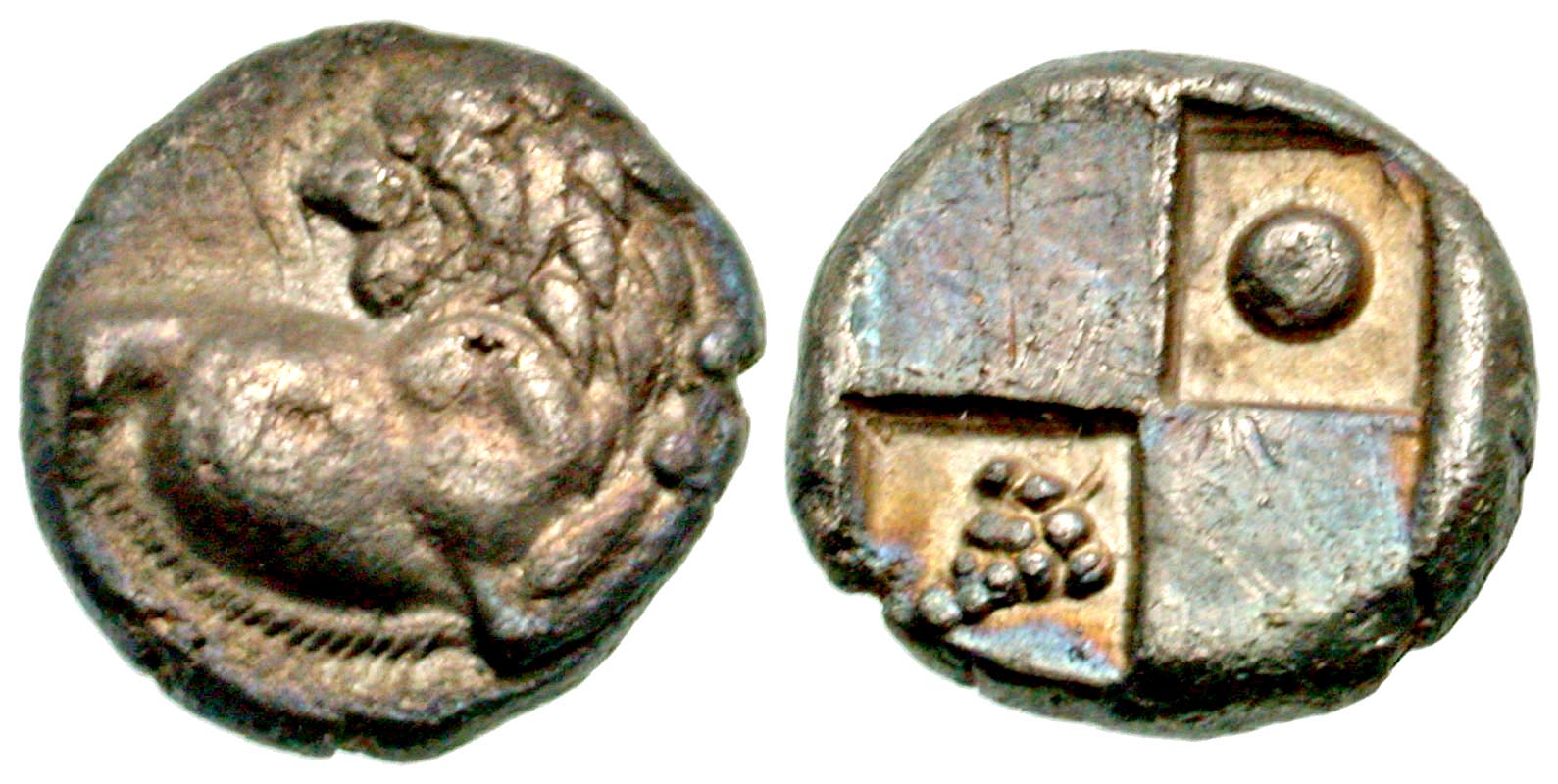 Thrace, Cherronesos. 400-350 B.C. AR hemidrachm (12.5 mm, 2.47 g). Forepart of lion right, head turned back / Quadripartite incuse square, alternate depressions deeper. In one quadrant, pellet, in opposite quadrant, bunch of grapes. McClean 4079; Weber 2419 and 2434; BMC 11. Good VF, well struck and centered, light toning trending towards rainbow on reverse.