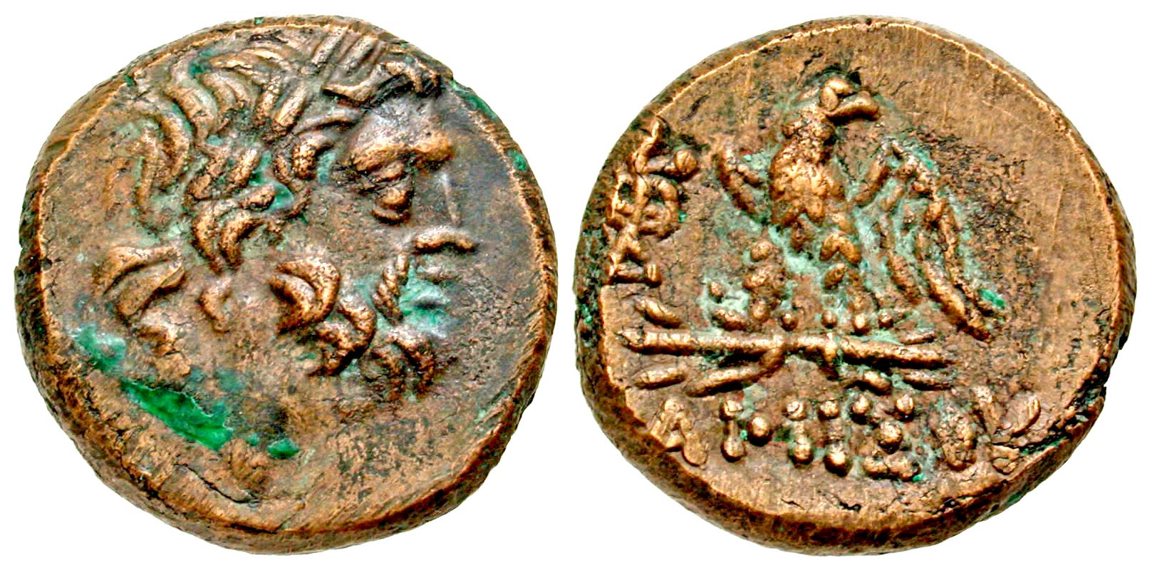 Pontos, Amisos. Under Mithradates VI, Eupator. 120-63 B.C. AE 21 (21 mm, 8.81 g, 11 h). Laureate head of bearded Zeus right / AMIΣOY, ethnic in exergue beneath eagle standing facing on thunderbolt, head right, wings open; to left, monogram . SNG von Aulock 56. Good VF, Toned tan with green highlights in recesses.