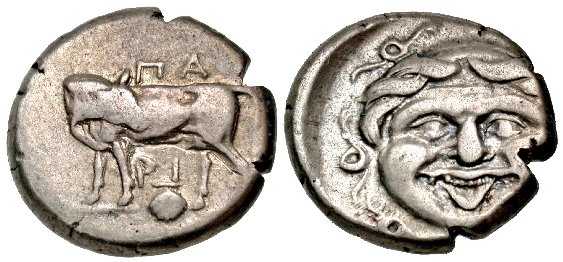 Mysia, Parion. 4th century B.C. AR hemidrachm (13.4 mm, 2.31 g, 6 h). [Π Α] / Ρ Ι above and below bull standing left, looking back; bucranium on exergual line / Gorgoneion. SNG Fran 1380; SNG von Aulock 7423 (or 1319?) ; SNG Cop --. VF.