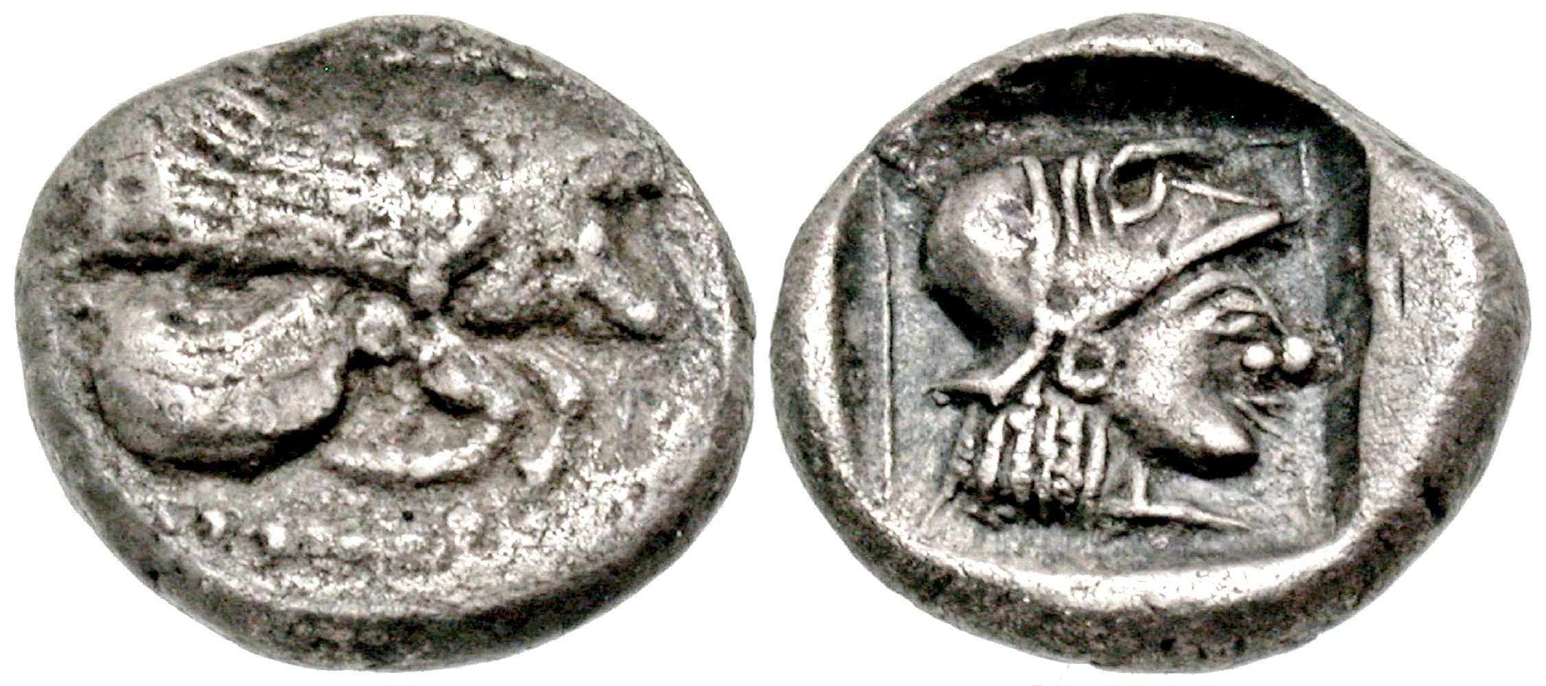 Ionia, Klazomenai. ca. 5th century B.C. AR diobol (10.7 mm, 1.27 g, 1 h). Forepart of winged boar, flying right / Head of Athena in incuse square. BMFA 1849; SNG Keckman 304. VF. Very Rare.