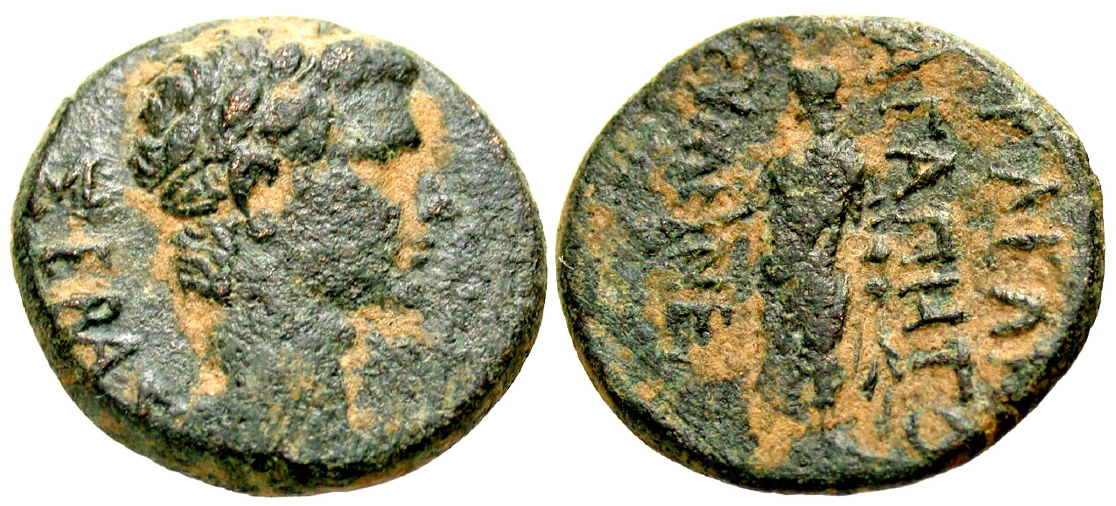 Phrygia, Eumeneia. Tiberius. A.D. 14-37. AE 19 (18.5 mm, 4.12 g, 11 h). Kleon Agapetos, magistrate. ΣΕΒΑΣΤΟΣ, laureate head right / KΛEΩN AΓAΠHTOΣ / EΥMENEΩN, Zeus standing left, holding patera and scepter. RPC I, 3147; SNG von Aulock 3589. Good Fine, earthen brown patina.
