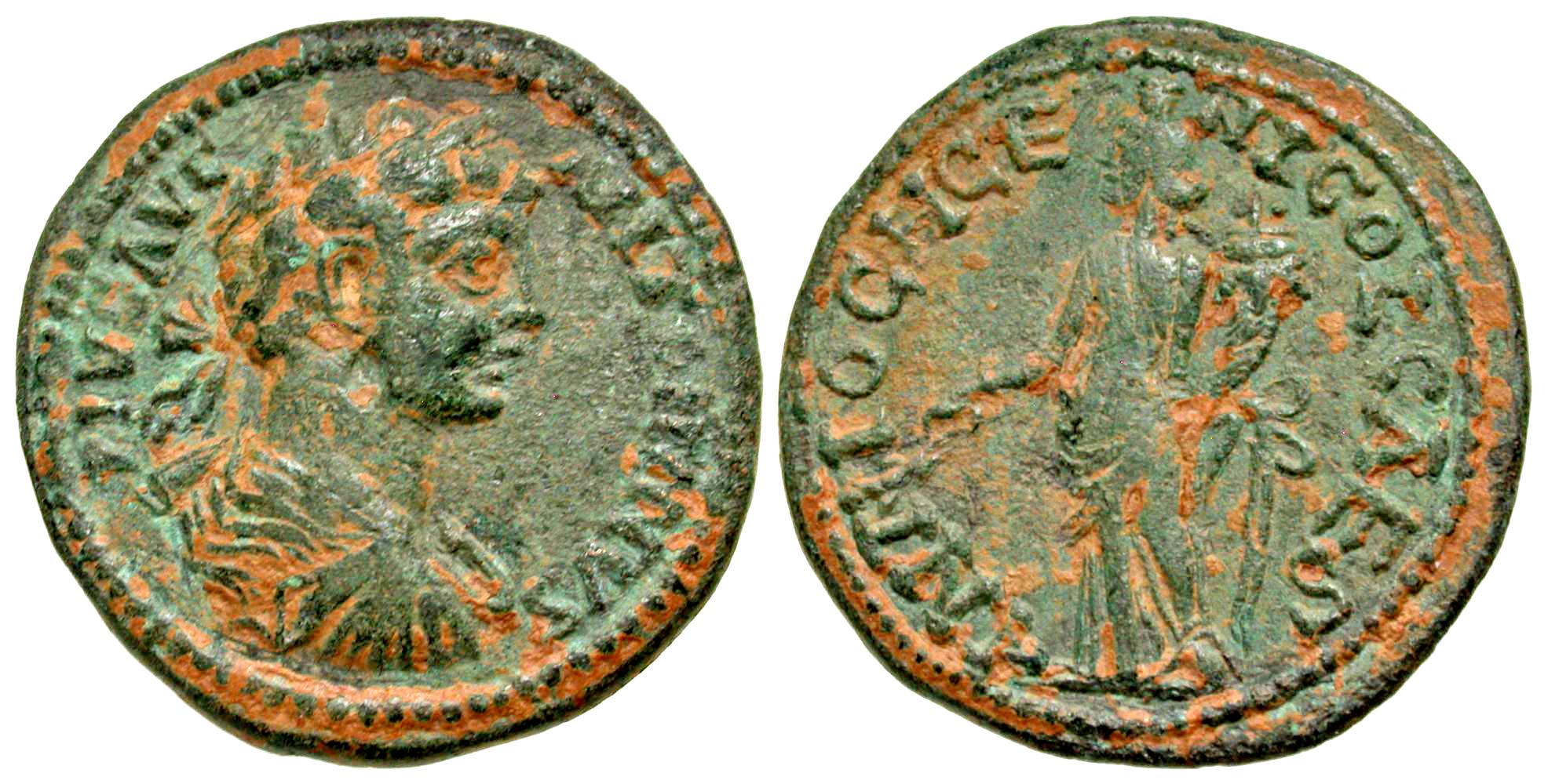 Pisidia, Antiochia. Caracalla. A.D. 198-217. AE 24 (23.8 mm, 5.71 g, 6 h). Struck ca. A.D. 205. IMP CAES M AVR ANTONINVS A, laureate, draped and cuirassed bust of Caracalla right / ANTIOCH GENI COL CAES, Pax standing left, holding branch and cornucopia. Krzy anowska XVIII/34; SNG France -. VF, green patina with red deposits. Scarce.