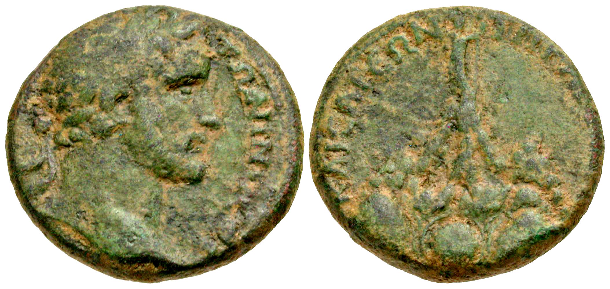 Cappadocia, Caesarea. Antoninus Pius. A.D. 138-161. AE 23 (23 mm, 10.41 g, 12 h). ΑΝΤΩΝΙΝΟ ЄΒΑ ΤΟ , laureate head of Antoninus Pius right / ΚΑΙ ΑΡЄΩΝ Τ Π ΑΡΓΑΙ ЄΤ Α (or similar - ending date is indistinct), Mount Argaeus; on summit, Helios standing left, holding globe and long scepter. Cf. Syd. Suppl. 309a. Fine, green patina with earthen adhesions.