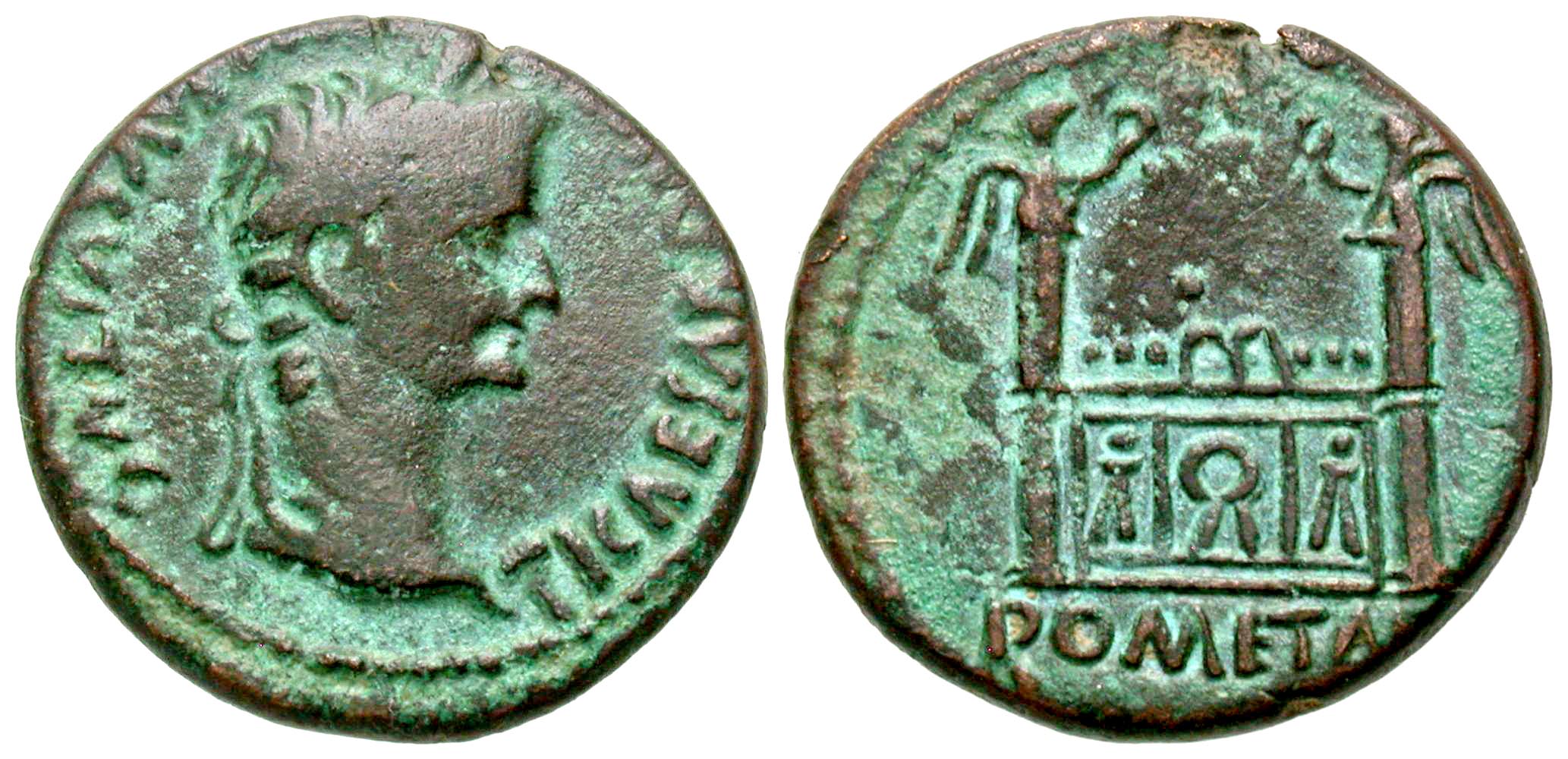 Tiberius. A.D. 14-37. AE semis (18 mm, 3.52 g, 11 h). Lugdunum (Lyon) mint, Struck A.D. 14-21. TI CAESAR DIVI AVG F AVGVSTVS, laureate head right / ROM ET AVG, The Great Altar of Lugdunum: altar enclosure; panels decorated with corona civica flanked by figures holding laurel branches; altar flanked by columns surmounted by statues of Victory standing vis-à-vis, each holding palm frond and wreath. RIC I 31; Lyon 155. Near VF, Green patina.