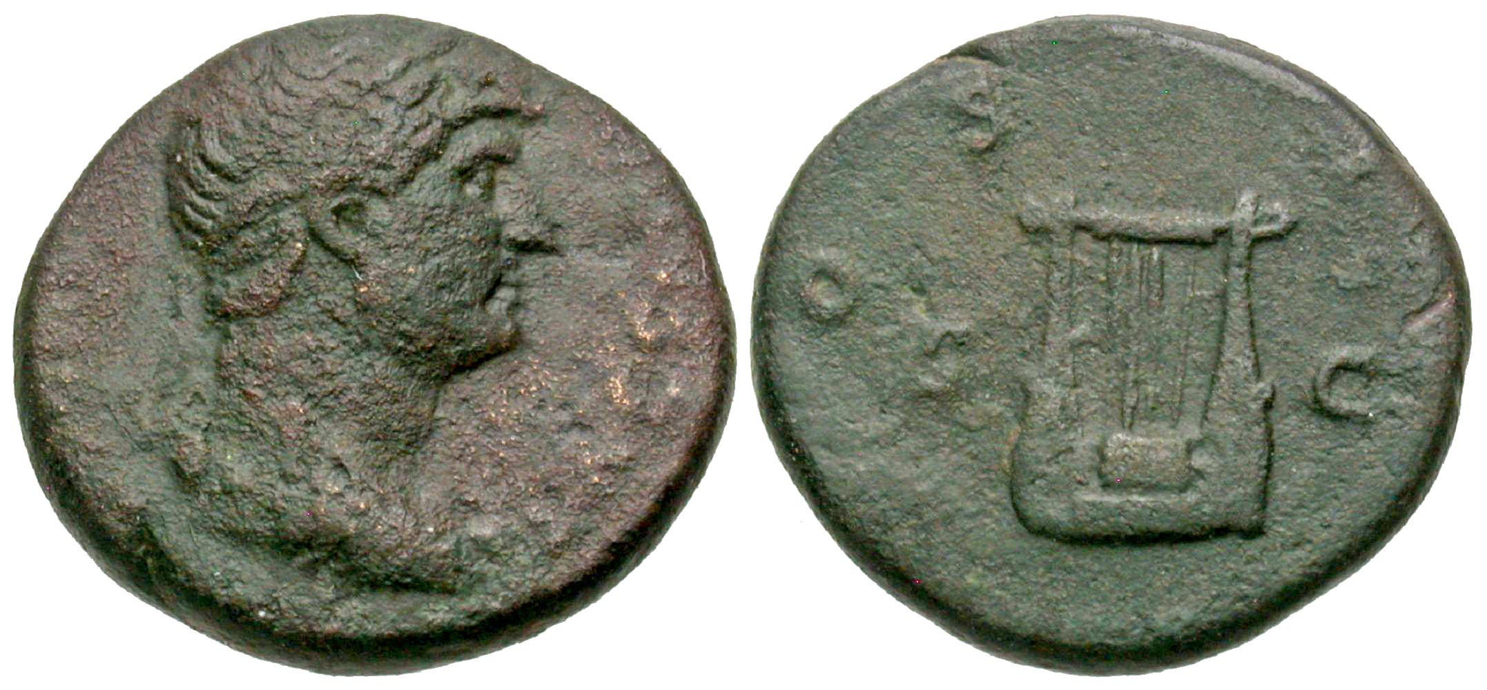 Hadrian. A.D. 117-138. AE semis (17.4 mm, 3.67 g, 7 h). Rome mint, for use in Syria, struck A.D. 125-128. HADRIANVS AVGVSTVS, Laureate and draped bust of Hadrian right / COS III, lyre. RIC 688; McAlee 547a. aVF.