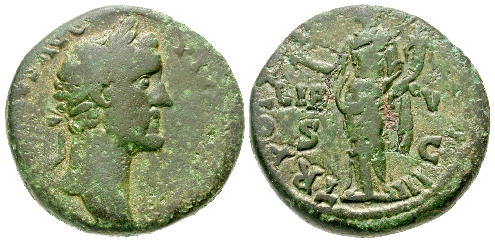 Lot 141. Antoninus Pius. A.D. 138-161. AE sestertius. Rome mint, Struck A.D. 157-158.