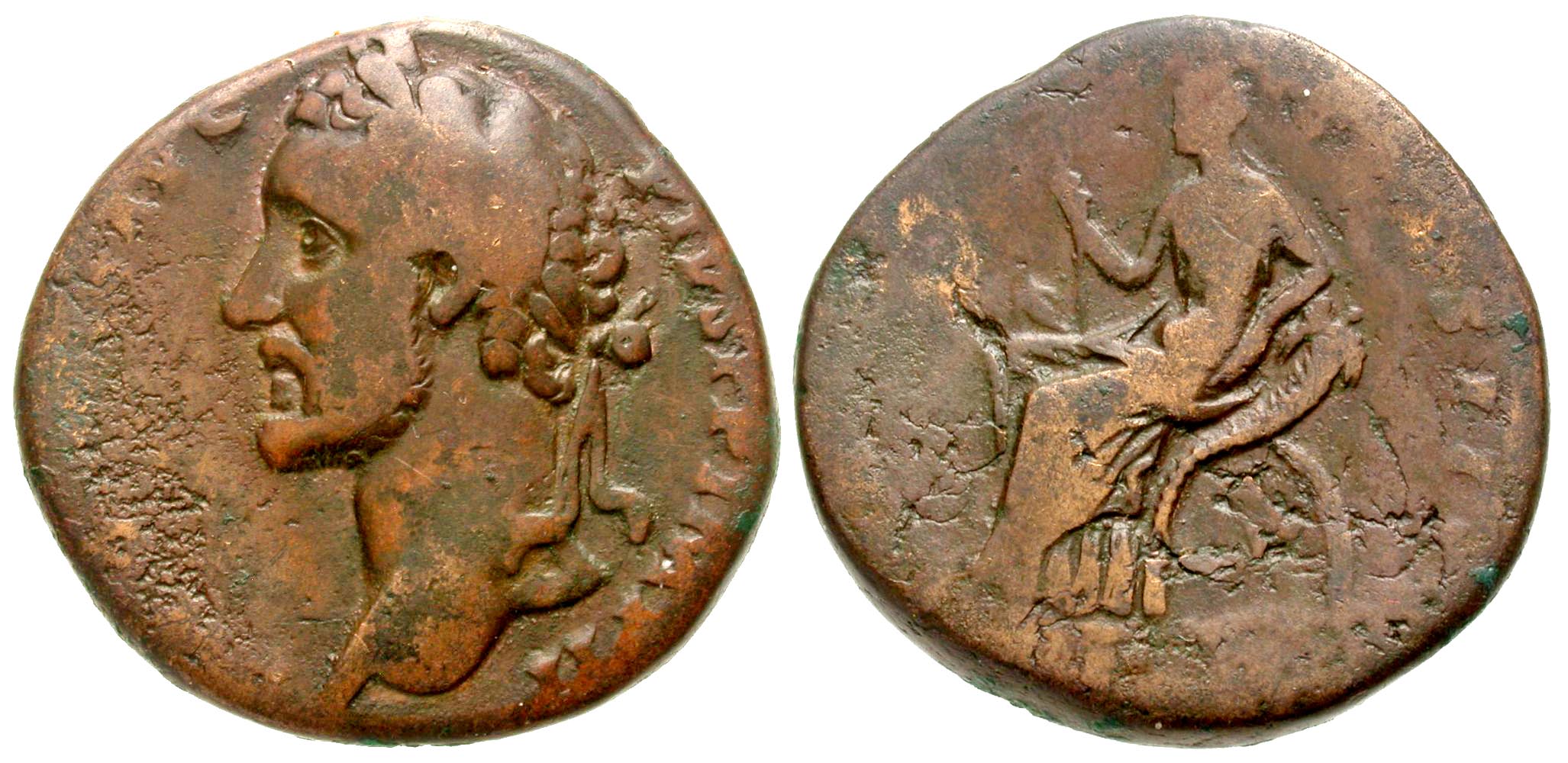 Antoninus Pius. A.D. 138-161. AE sestertius (30.6 mm, 22.06 g, 12 h). Rome mint, Struck A.D. 143-144. [ANTONINVS] AVG PIVS P P IMP II, laureate head of Antoninus Pius left / [TR POT XX CO]S III[I], Justitia (?) or Securitas (?) seated left on chair formed by two crossed cornucopiae, holding scepter and resting arm on cornucopiae - back of chair; // SC. RIC III 967 var. (head left on obverse); Cf. C 1008; Cf. SRCV 4252. Good Fine, well worn losing some legend on both sides, areas of porosity on both sides, two-tone brown patina. Not listed with head left in RIC or SRCV, rare?.