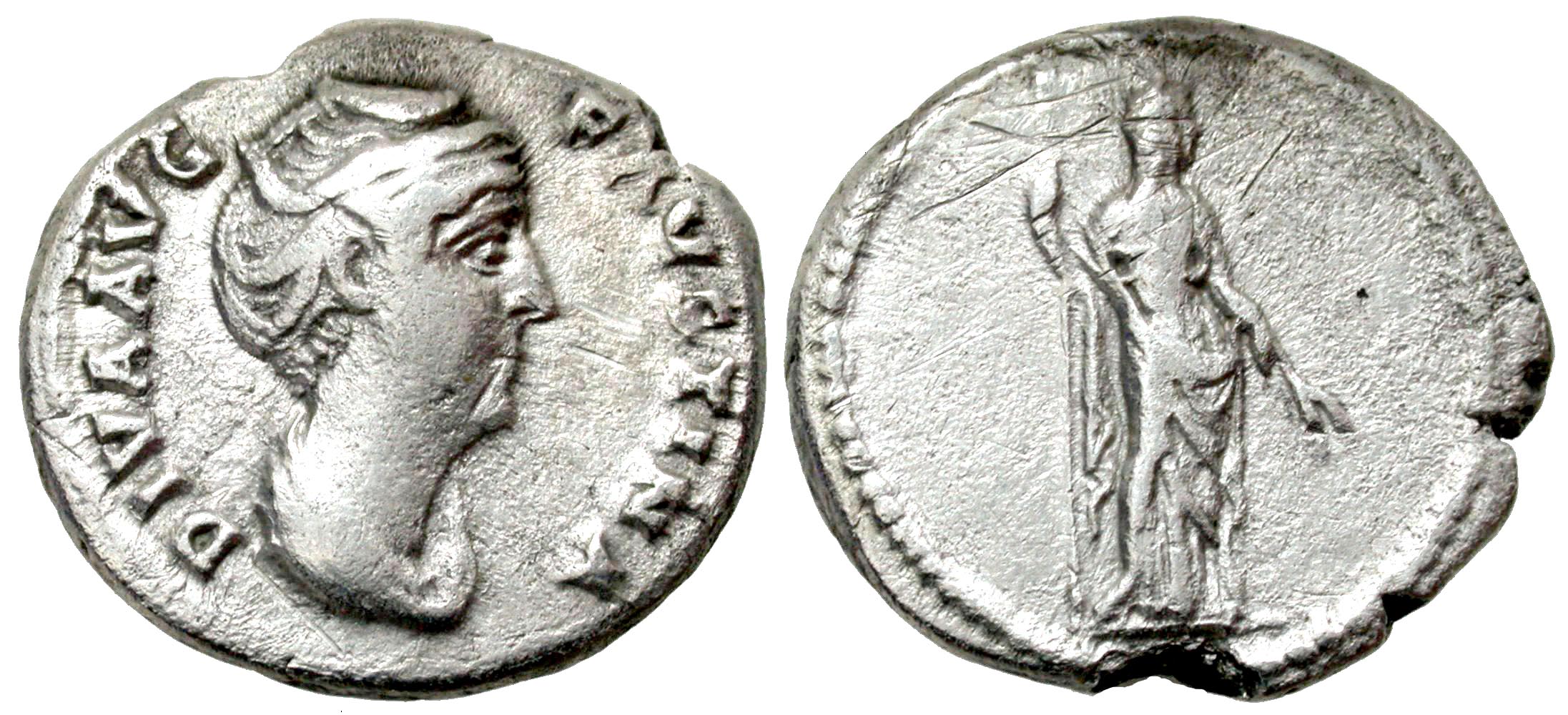 Lot 145. Diva Faustina I. Died A.D. 140/1. AR denarius. Rome mint, struck A.D. 140-141. Scarce. Ex Tom Mullally Collection.