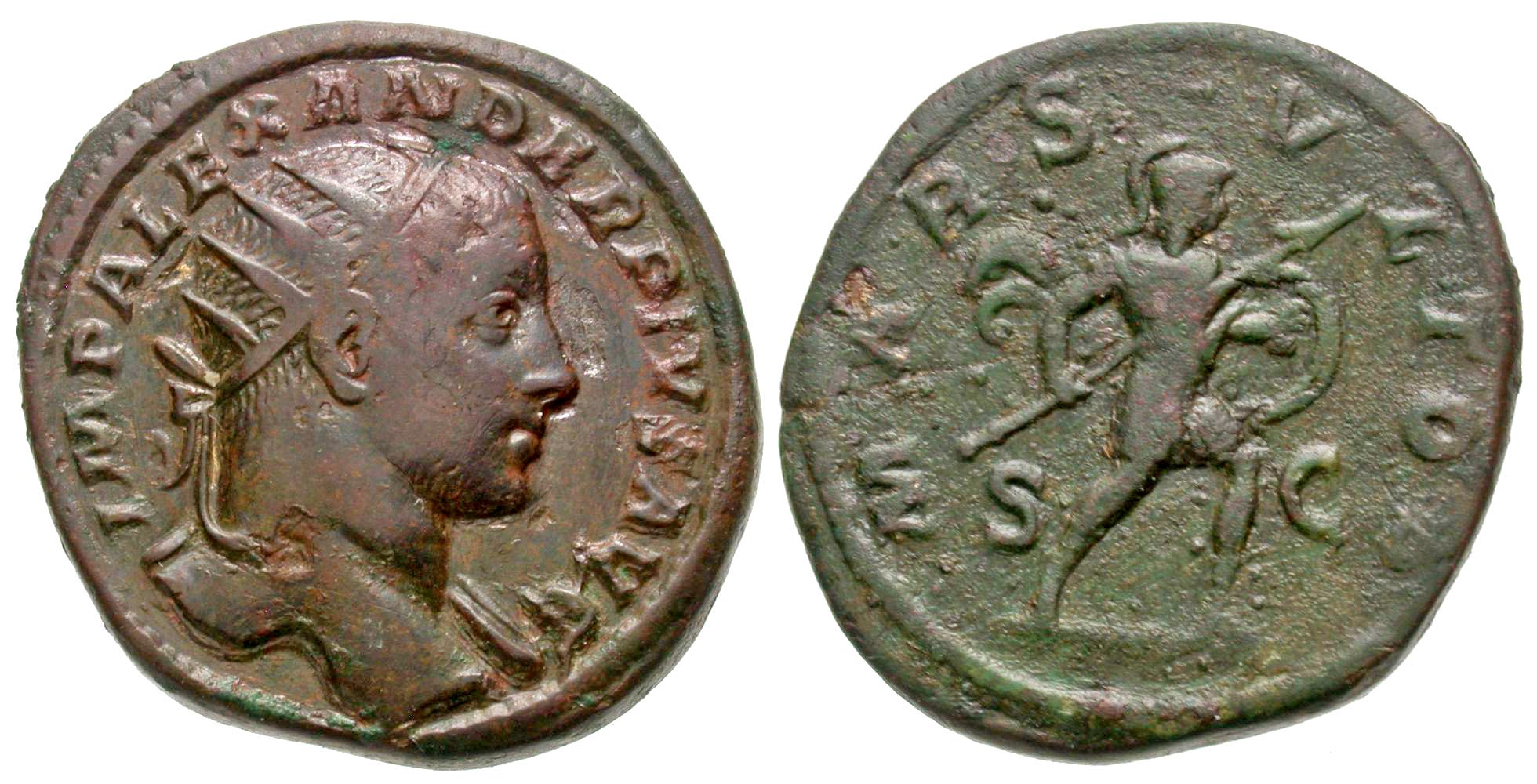 Severus Alexander. A.D. 222-235. AE dupondius (26.3 mm, 11.94 g, 1 h). Rome mint, Struck A.D. 232. IMP ALEXANDER PIVS AVG, Radiate bust of Severus Alexander right, drapery on left shoulder / MARS VL[T]O[R], Mars in helmet and full armor hustling right, holding spear and shield; S - C. RIC IV 636; C 164; SRCV 8031. VF, well struck in good style on full-size, round flan; obverse shows some evidence of amateur "smoothing" of the green/brown patina, reverse is undisturbed olive patina.