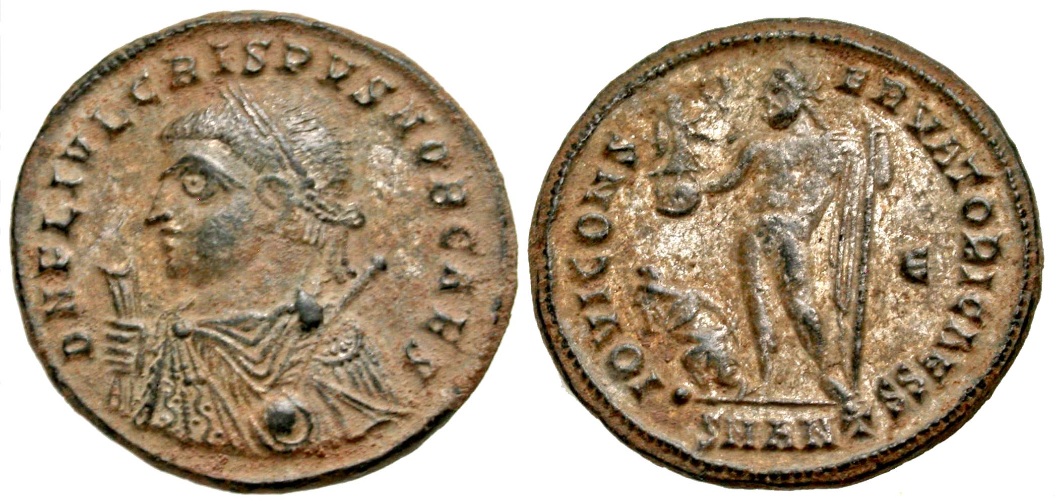 Crispus. Caesar, A.D. 317-326. BI follis (19.4 mm, 2.95 g, 6 h). Antioch mint, Struck A.D. 317-318. D N FL IVL CRISPVS NOB CAES, laureate bust of Licinius Jr. left, wearing consular robes and holding mappa, globe and scepter / IOVI CONS-ERVATORI CAESS, naked Jupiter standing facing, head left, holding Victory on globe and scepter; kneeling captive at his feet to left; Є // SMANT. RIC VII 28. Good VF / VF, apparently as-dug and untouched; looks like it is fully silvered, scant gray/tan deposits over all .