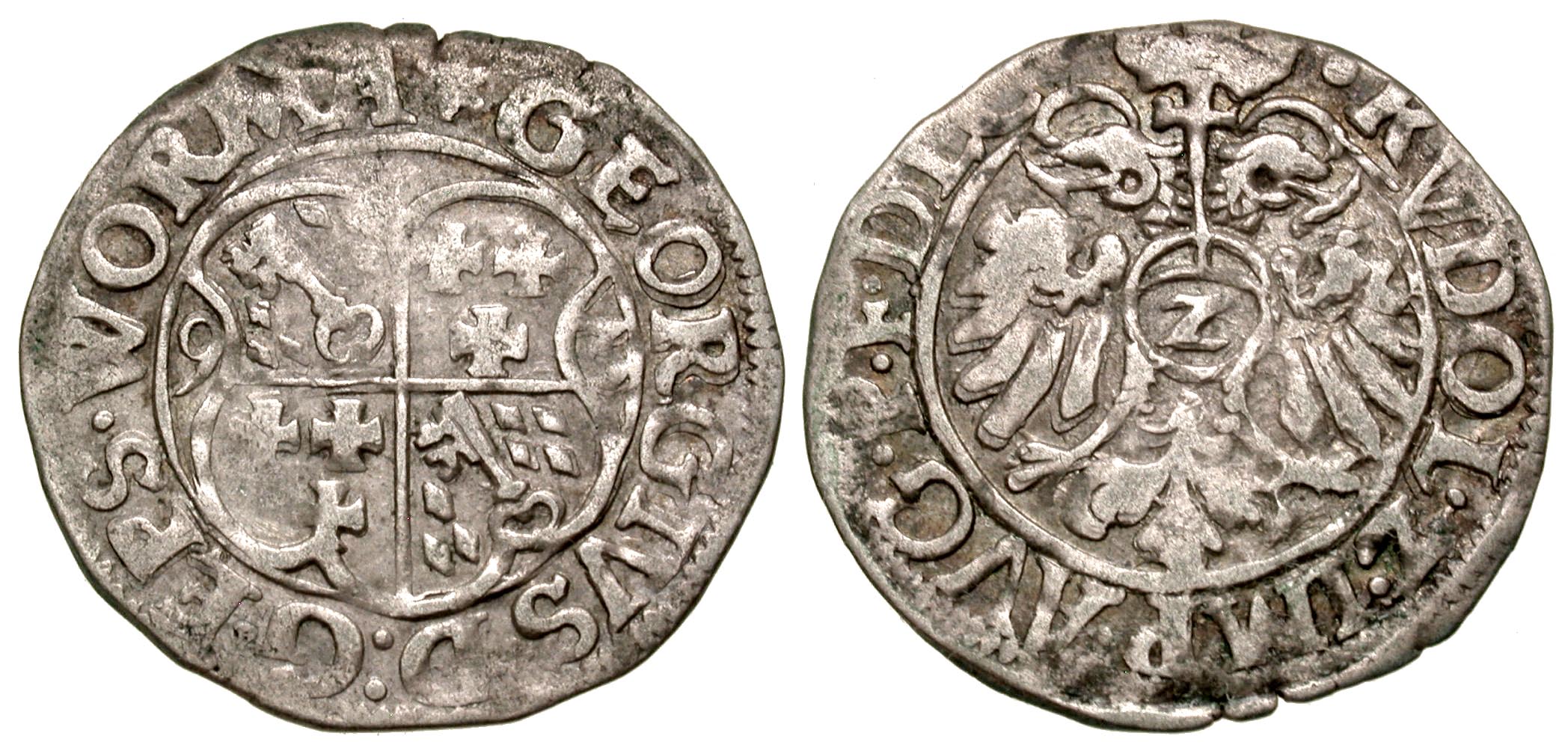 German States, Worms. Georg von Schönenberg. 1580-1595. AR 1/2 batzen (19.3 mm, 1.26 g, 7 h). 1593. + GEORGIVS D : G IPS ? WORMS, arms of Worms / ? RVDOL ? E ? IMP ? AVG ? P ? F ? DEC, double-headed imperial eagle facing, wings spread, on its breast, globe with crowned cross, Z in middle of globe.