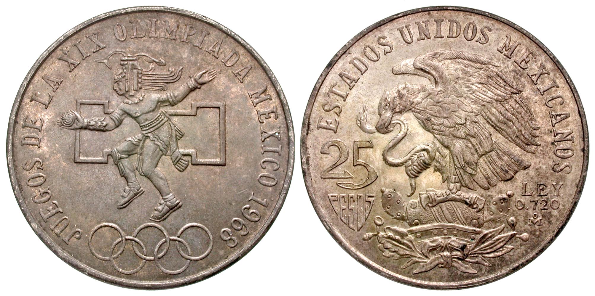 Mexico. AR 25 pesos. Mexico City Mint, 1968-MO. KM-479.1. UNC, Variety with even rings and straight snake's tongue.