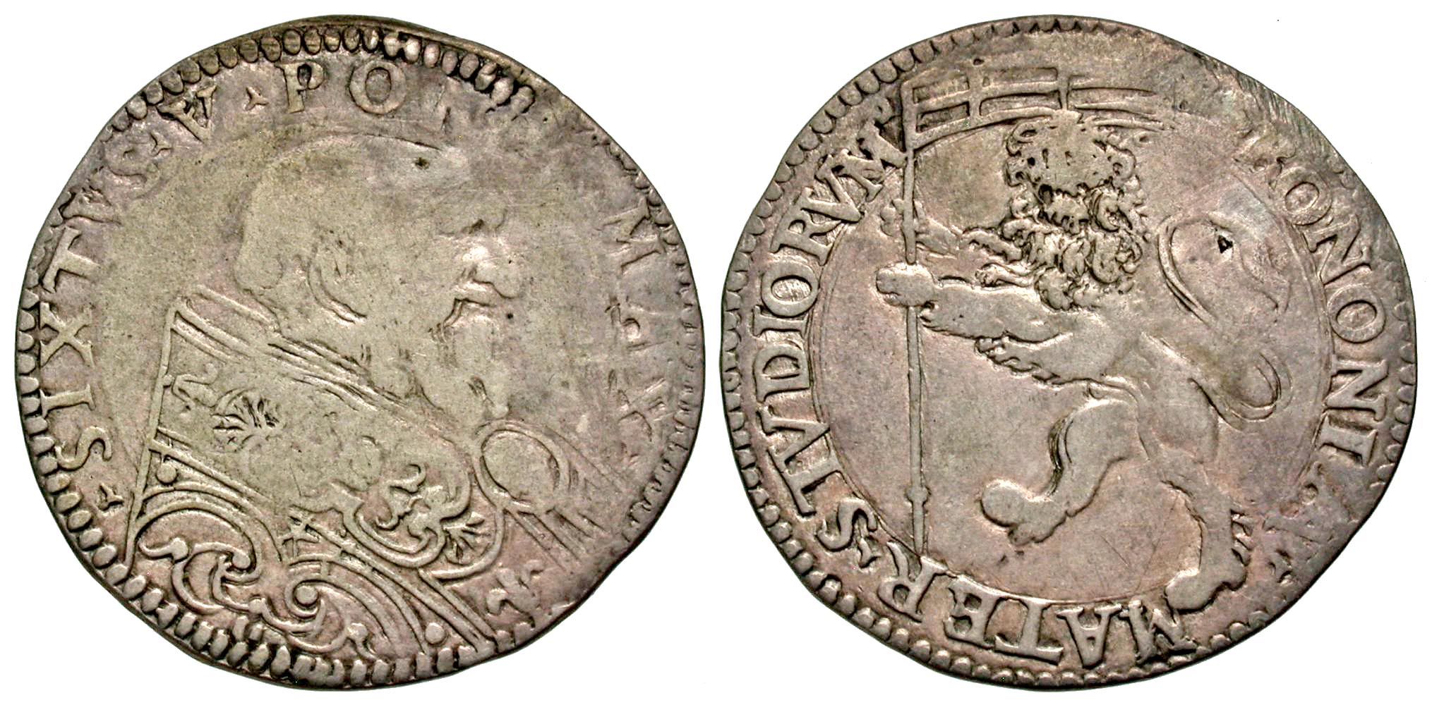 Papal States, Bologna. Sixtus V. 1585-1590. AR bianco (28.5 mm, 4.34 g, 9 h). . Bust of Sixtus right within dotted border / Lion standing, holding banner. Muntoni 98; Ry 45; Berman 927. F-VF, some areas of weak struke.