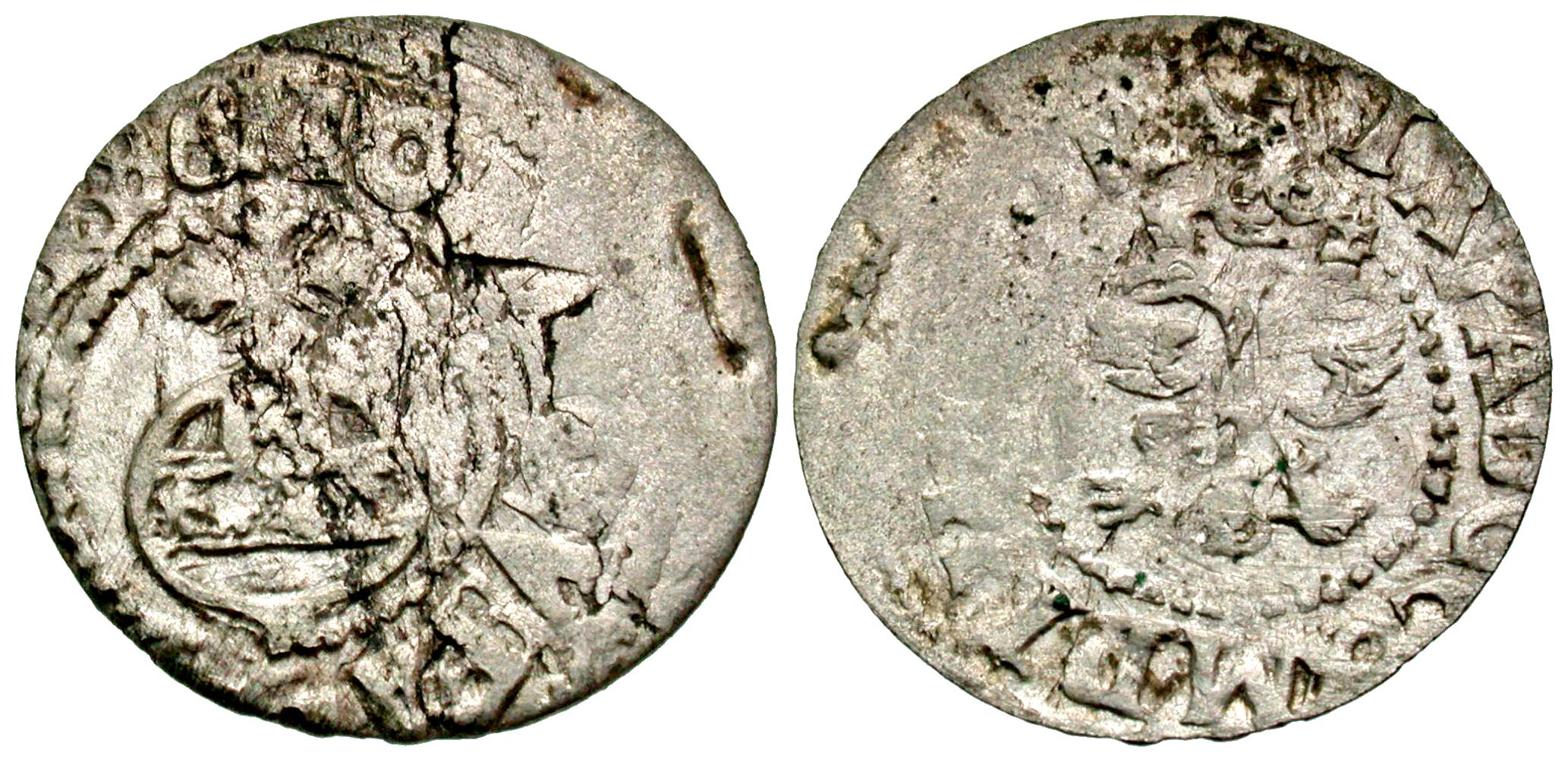 Russia, Empire. Ivan V and Peter I. Co-rulers, 1682-1689. BI ?Chekh of Sevsk? (18.9 mm, .88 g, 12 h). 1686. Crowned double-headed eagle, Latin initials around / Orb within beaded circle, Latin legend and date around. Diakov p.24, Sp. fig. 97; Ryabtsevich. Sev 9. near EF, choice for issue. Extremely Rare.