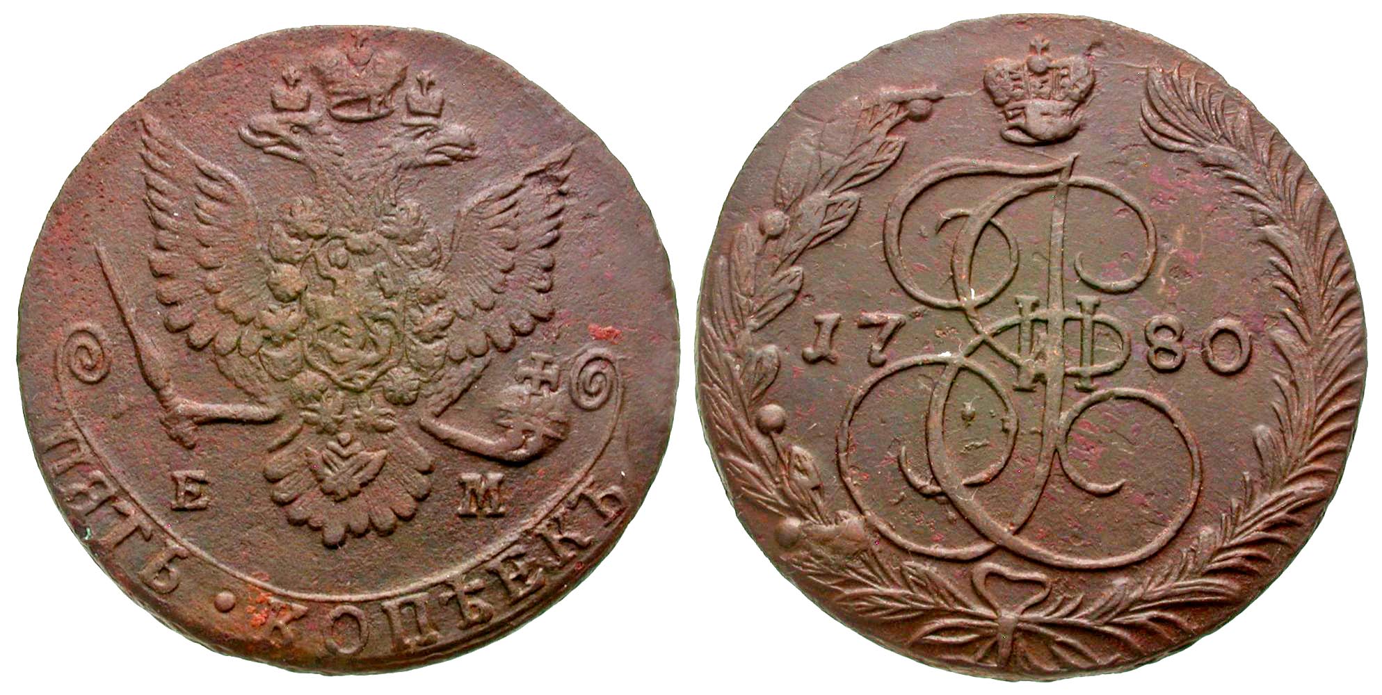 Lot 307. Russia. Catherine II, the Great. 1762-1796. AE 5 kopeks. Ekaterinburg Mint, 1780-EM.