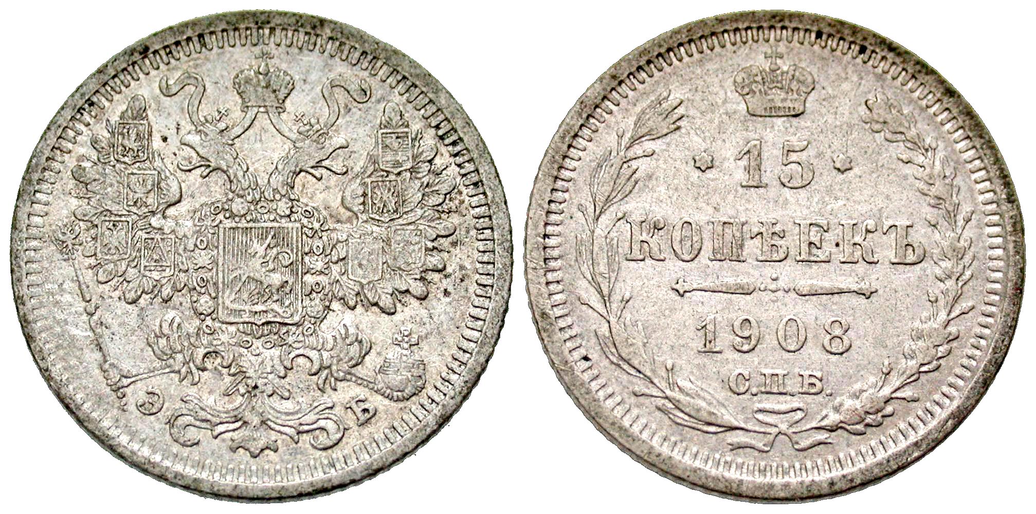 Russia. Nicholas II. 1894-1917. AR 15 kopeks. .500 AR. St Petersburg mint, 1908. Crown with ribbons above double-headed imperial eagle holding globus cruciger and scepter in talons, mint master's initials in lower field / · 15 · / [KOPECKS] / 1908 / [S. P.]; , crown above denomination , date and mintmark in four lines; all within wreath of laurel and oak. Y 21a.2. Good VF, light gray original toning.