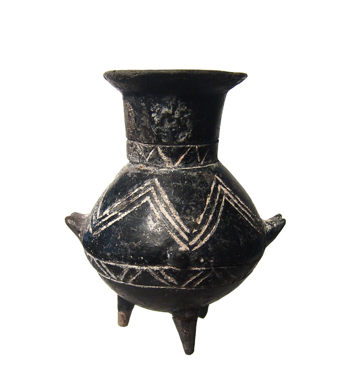 A Yortan black-ware vessel from Anatolia, Early Bronze Age II, ca. 2700 - 2400 B.C. , the round body resting on three tapered feet, the neck tall with flared mouth and two lug handles. The vessel is incised with intersecting lines filled with lime or chalk for contrast. The rim with two holes to secure a lid, the two lug handles pierced likely for suspension. H: 4 1/8 in. (10.4 cm). Some minor repair and weathering overall, two of the three legs with antique restoration. Ex Rilling collection.Estimated Retail Value: $350-500.