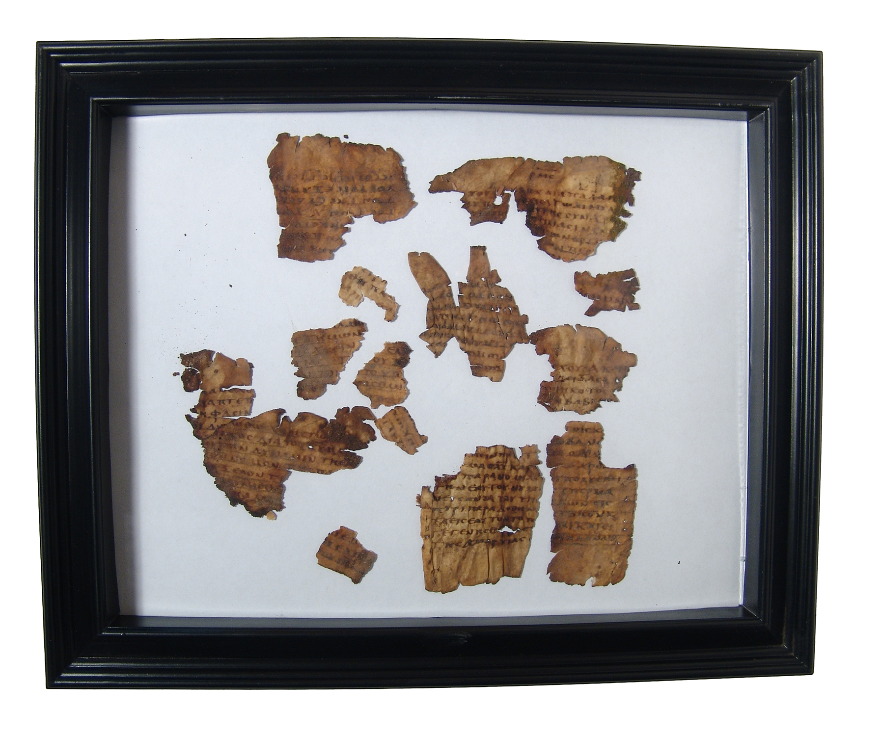 A fragmentary vellum page from a Coptic manuscript, ca. 9th-12th Century A.D. , with small, neatly penned script in at least three columns. From a religious book. Frame measures 11 1/8 x 9 1/8 in. (28.2 x 23.2 cm).Ex Rilling collection.Estimated Retail Value: $250-350.